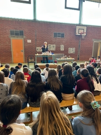 Große Augen machten die Kinder, als ein Glasbläser aus Coburg sein Handwerk vorführte. Er stammt aus einer Glasbläserfamilie und erklärte anschaulich, wie Glas entsteht – aus Quarzsand, Soda, Pottasche und Kalk – und wie es mit heißer Flamme geformt wird. Die blaue Flamme ist besonders heiß, die gelbe kühler. Je kälter das Glas, desto stärker zeigt sich die Farbe. Mit viel Humor und unterhaltsamen Erklärungen fesselte er die Kinder und brachte sie immer wieder zum Lachen. Live fertigte er Figuren wie eine Coburger Christbaumspitze, eine bunte Blumenvase und einen eleganten Schwan. Immer wieder ging ein hörbares Staunen durch die Reihen – ein tolles Erlebnis! Vielen Dank für den Besuch.